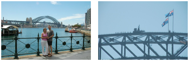 Na most Harbour Bridge są organizowane wycieczki - wspinanie się po południowej stronie mostu, w ciągu dnia lub po zmroku. Grupa wspinających się dostaje ochronne ubranie i dokładne instrukcje co do wspinaczki. Podczas wchdozenia każdy turysta jest przypięty liną do mostu. Wycieczka dochodzi do samego szczytu łukiem po stronie wschodniej, na szczycie przechodzi się na drugi łuk, zachodni, i tym schodzi się na dół. Cała wycieczka trwa 3.5 godziny. Nie braliśmy pod uwagę takiej eskapady, głównie ze względu na Piotrka lęk wysokości (ja też bym się trochę bała) i generalnie nasz niezbyt długi pobyt w Australii.