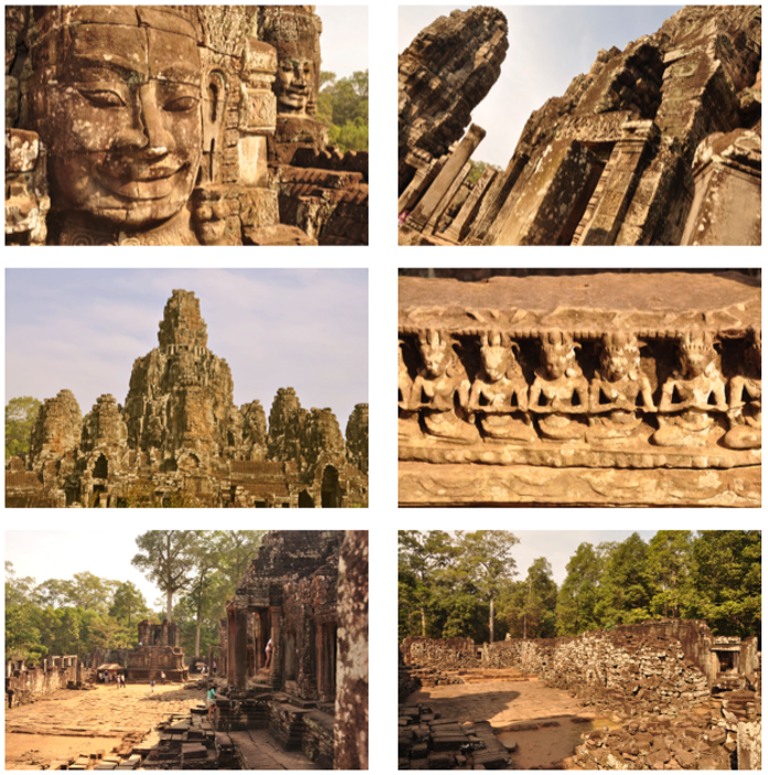 Świątynia Bayon zbudowana została w 12 wieku jako świątynia Buddyjska. Znajduje się w centrum Angkor Thom (dosłownie “Wielkie Miasto”) - ostatniej i najtrwalszej stolicy Imperium Khmer’ów. Świątynia charakteryzuje się ponad 2000 gigantycznymi twarzami wykutymi w kamienistych 54-ech wieżach (których przetrwało 37). Każda wieża to 4 twarze skierowane w czetrech kierunkach. Twarze najprawdopodobniej reprezentują buddyjskiego boga i pokreślają jego wszechobecność.