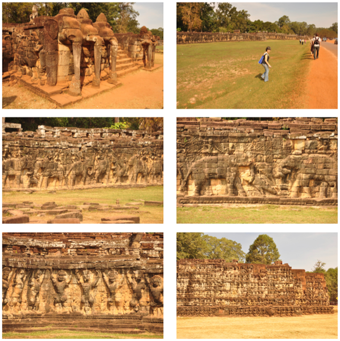 Spacer wzdłuż Terrace of the Elephants - 2.5m wysoka i 350 m długa ściana-platforma ozdobiona wyrzeźbionymi słoniami. Stąd, między innymi, król obserwował powracającą z wojny armię. Środkowa część ściany przedstawia wyrzeźbione realnych rozmiarów lwy i garuda (wielkie bóstwa z Hinduskiej i Buddyjskiej mitologii).