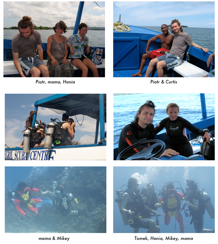 Na drugi dzień jeszcze wszyscy zanurkowaliśmy z łodzi a resztę pobytu Hania z Tomkiem chadzali własnymi drogami bratając się z lokalną społecznością. Teściowa nurkowała z nami i zaliczyła tyle nurów i na tyle dobrze dawała sobie radę, że z naszą pomocą (musiała trochę teori poczytać) Curtis zaliczył jej pełny certyfikat PADI Open Water Diver czyli to samo co ja mam. Nurkowaliśmy głównie z Curtisem (Chris zwolnił się i poszedł pracować do innego centrum nurkowego) ale udało nam się też zejść pod wodę z Mikey i było jak zwykle wesoło.