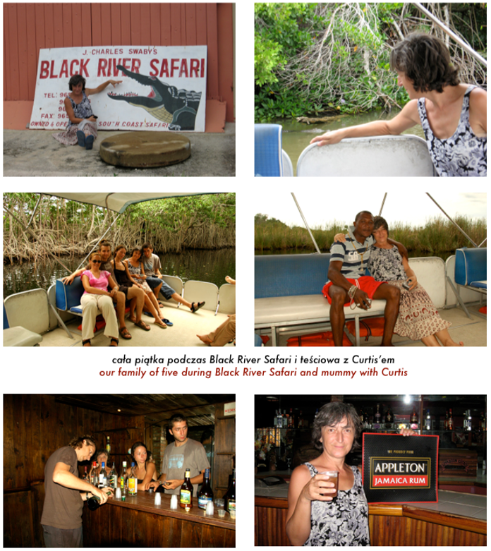 Przez większość pobytu Hania i Tomek chadzali własnymi drogami integrując się z lokalną społecznością i zwiedzając okolice (wybrali się nawet do Kingston - kilka godzin jazdy samochodem na drugą stronę wyspy, my spasowaliśmy). W przeddzień wyjazdu zabraliśmy całą rodzinkę na zwiedzanie i zaliczliśmy Black River Safari i zwiedziliśmy fabrykę rumu Appleton Estate (to te miejsca co zobaczyliśmy sami podczas wizyty w marcu). Tym razem nie wykupiliśmy wycieczki przez hotel tylko dogadaliśmy się z Curtis'em i to z nim objechaliśmy te miejsca. Zabral sobie do towarzystwa jakąs dziewuchę ale nie wiemy do końca czy to była jego laska czy nie. Wodospadów YS Falls nie udało nam się zobaczyć bo akurat był to poniedziałek a w ten dzień wodospady są zamknięte. Black River wszystkim się podobało, a w fabryce rumu nie dało się ich wszystkich odciągnąć od degustacji ;)