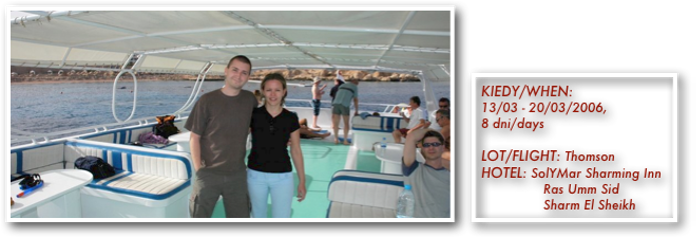 Te wczasy wykupiliśmy w całości w biurze podróży Thomson. Mieszkaliśmy w hotelu Sol Y Mar Sharming Inn, około 10 min jazdy samochodem od Naama Bay (centrum Sharm El Sheikh); ze śniadaniami i obiadokolacją. Hotel nawet ok, duże baseny, dobre jedzenie. Pomimo tego że klimatyzacja nam nie działała tak jak powinna i dostaliśmy pokój z dwoma pojedynczymi łóżkami (które połączyliśmy ze sobą), za bardzo nam to nie przeszkadzało bo za wiele czasu w hotelu nie spędzaliśmy.