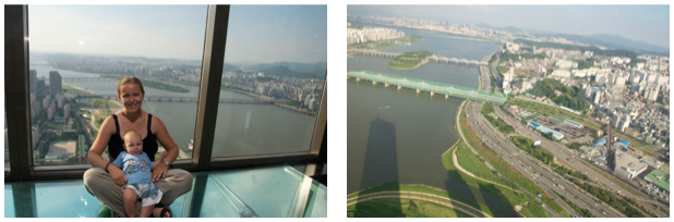 Widoki świetne i pogoda słoneczna więc cały Seul było ładnie widać. W krajobrazie przeważają bloki; rzeka Han ze swoimi mostami bardzo ciekawie się prezentowała z góry. U góry natknęliśmy się na dwie Polki, i zagadałam do nich ale jedna się uśmiechnęła tylko i poszła dalej... nie wzruszyło ich spotkanie z rodakami. Ich strata ;)