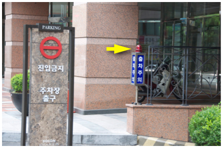 Ostrzegacze o nadjeżdżającym samochodzie - zainstalowane przy każdym wyjeździe z parkingu. Wszystkie parkingi w Korei są podziemne i na każdy wieżowiec przypada kilka poziomów podziemnego parkingu.