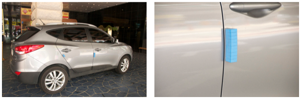 Blue pieces of rubber stuck to the car doors so that they won’t knock other cars when opening.