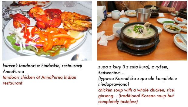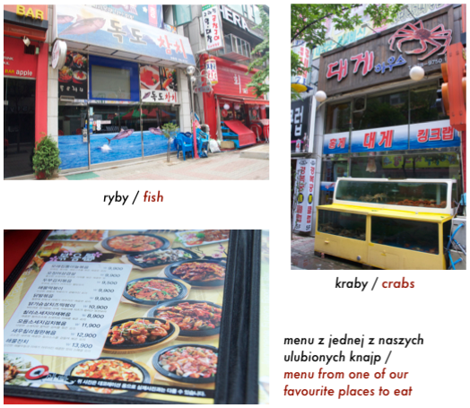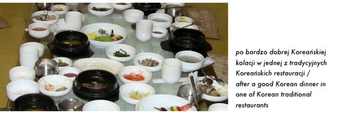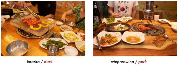 Cenowo jadanie w knajpach jest bardzo tanie. Podobno tańsze nawet niż kupowanie produktów w sklepie i przygotowywanie samemu w domu. Za 2 osoby w ‘wieprzowej’ restauracji zapłaciliśmy w zeszły weekend 30,000 WON co daje okolo 78 PLN. Trochę za dużo zamówiliśmy więc spokojnie 3 osoby by się najadły. Za 5 osobową kolację w inny dzień zaplaciliśmy 65,000 WON (około 170 PLN). Wszystko zależy od tego co się jada. Kurczaki, wieprzowina i morskie stworzenia są najtańsze. Wołowina jest tutaj bardzo droga - za 3 osoby ktoregoś dnia zapłaciliśmy 93,000 WON (około 240 PLN)