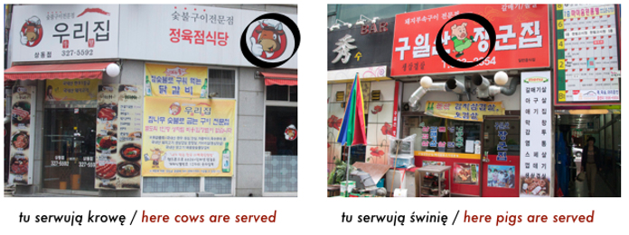 Restauracje są jedzeniowo tematyczne to znaczy jak na szyldzie widać krowę to serwuja tylko wołowinę, kurczaka - serwują tylko kurczaki, itd.