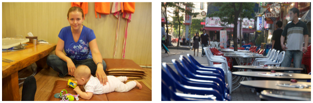 Prices of dining out here are really low. Apparently it is even cheaper to dine out than buy all products and cook at home. For 2 people in a ‘pork’ restaurant we paid last weekend 30,000 WON which is around £17. We ordered a little bit too much so it would be enough for 3 persons. On a different occasion for 5 people we paid 65,000 WON (around £40) . It all depends what you eat and where. Chicken, pork and sea food are the cheapest. Beef is really expensive - the other day for 3 persons we paid 93,000 WON (around £60).