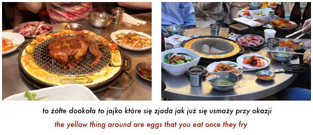 Mięso często grillują kelnerki, ale czasem dają surowe mięso i samemu można grillować. Jak jadamy wieprzowinę czy wołowinę to jeden czy dwa kawały mięsa wrzucane są na grilla, jak się zgrillują to nożyczkami rozcinane są na małe kawałeczki i potem można jeść jak kto woli - napopularniejsza opcja to zawijanie tych kawałeczków gotowego mięsa w liść sałaty, dodanie czosnku czy szczypiora czy jakiegoś sosu, zawinięcie wszystkiego razem ciasno i na raz do buzi. Bardzo smaczne.