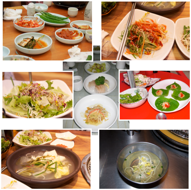 With every main dish, we usually get sauces and side dishes. The most popular is Korean kimchi - different types of vegetables such as cabbage, radish, cucumbers, onion, but cabbage is the most common. It usually comes in a chilli sauce, and sometimes other veggies come in the chilli sauce as well, and sometimes on their own. Sometimes we get different types of soups, mainly cold with sprouts, or other veggies, some sort of broth but most of the time they taste like water with veggies.