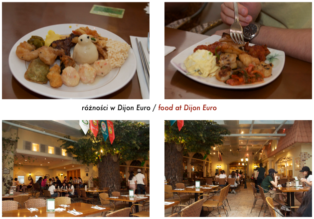 Dijon Euro Family Restaurant to jedno z moich ulubionych miejsc. Płaci się za osobę stałą kwotę (wieczorem to 18,900 WON - około 50 PLN), i można jeść i pić do woli. Dania są wystawione na zasadzie bufetu więc można ładować na talerz ile się zmieści bądź wracać po kilka razy, a dania są różne od spagetti, po sałatki, sushi, Koreańskie dania, kurczaki, rybę, warzywa, ryż, itp. Dania są podpisane niestety tylko po koreańsku (nijak się to przekłada na nazwę restauracji) więc jedynie po wyglądzie można się domyślić co to za danie. Mnie się bardzo podoba wystrój - na 8 piętrze, wewnątrz budynku ale ma się wrażenie jakby się było na zewnątrz, troche w klimacie francuskim.