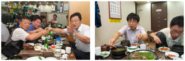 Tradycyjnie siedzieliśmy po koreańsku na ziemi przy niskim stole, z koreańskimi przystawkami i jedząc koreańskimi metalowymi pałeczkami. Mięso było juz gotowe tylko kelnerka wrzuciła je na palnik (nad parę) żeby było ciepłe. Ja zjadłam kilka małych kawałeczków ale mi nie smakowało. Jest trochę gumowe i nic specjalnego w smaku, więc spasowałam i zostałam przy kimchi i ryżu. Może psychicznie dlatego że wiedziałam że to pies, nie chciałam za bardzo jeść i nie za bardzo mi podchodziło.