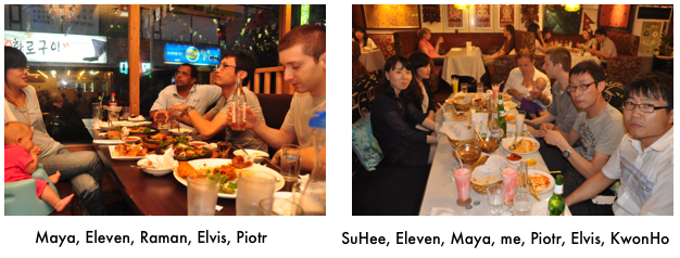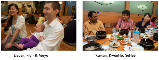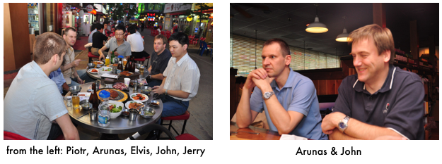 Co wieczór chodzimy na kolację z ludźmi z teamu Piotrka. Lokalni (Koreańczycy), z którymi Piotrek najwięcej współpracuje to SuHee i KwonHo. Reszta przyjezdna tak samo jak Piotrek i przylatują do Bucheon na 1-3 tygodnie, a potem wracają i pracują z domu przez 1-2 tygodnie. Większość jest z Suzhou w Chinach - Eleven, Jerry, Elvis, Kathy, ale jest też Raman z Indii,, John ze Szkocji, Arunas - Litwin z USA mieszkający w Suzhou ;), Walter z Belgii. Wszyscy są bardzo sympatyczni i wszyscy mowią po angielsku :)